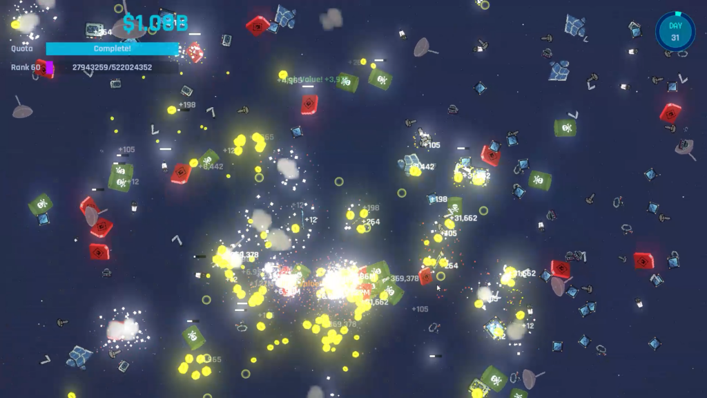 マウス操作でデブリを一掃。視界を埋め尽くす破片とクレジットの噴出が、圧倒的な作業の快感を生み出します。